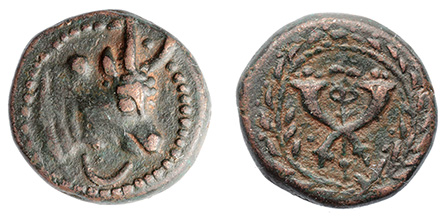 AE 16, 4.81g. 2nd-3rd cents. A.D. Head and neck of bull to right; crescent below. Rev. Caduceus between two crossed cornucopia. De Saulcy 65,3 = Mionnet, vol. 6, 653, 286(Uncertain mint). BMC_. SNG COP_. SNG Munich_. Scarce and with an attractive brown patina.