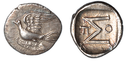 AR Hemidrachm, 2.33g. 17mm. c.100-60 B.C. magistrate: Polykrates(?). Dove flying to left. Rev. Large "sigma" and magistrate inititals within a shallow incuse square. HGC 215. BCD_. Fine multi- hued toning.