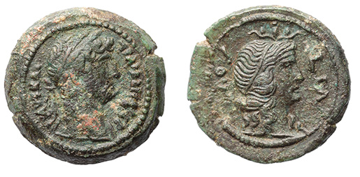 AE Obol, 5.68g. 19mm. Dated year 11= 126/7 A.D. Laureate head of Hadrian to right. Rev. Head of young Horus of Mount Kasion-Zeus Kasios to right wearing diadem and hem-hem crown. Köln 3418. Dattari 6346. RPC online III 6532.40(this coin). Emmett 1231.11. Dark brown patina with some encrustation on the obverse. This coin is among the finest known examples and the one that is used for the primary RPC on-line illustration.