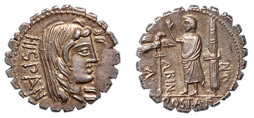 AR Serrate Denarius, 4.03g. 20mm. HISPAN. Veiled head of Hispania to right. Rev.A POST A F S N A BIN. Togate figure standing to left and raising hand between legionary eagle and fasces. Lovely toning.