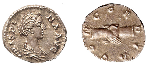 AR Denarius, 2.74g. 18mm. Rome, 178-182 A.D. CRISPINA AVG. Draped bust of Crispina to right with hair arranged in waves and knotted in a chignon at back of head. Rev. CONCORDIA. Clasped hands. RIC 279a. BMC 29. Light die break on reverse. Attractive toning.
