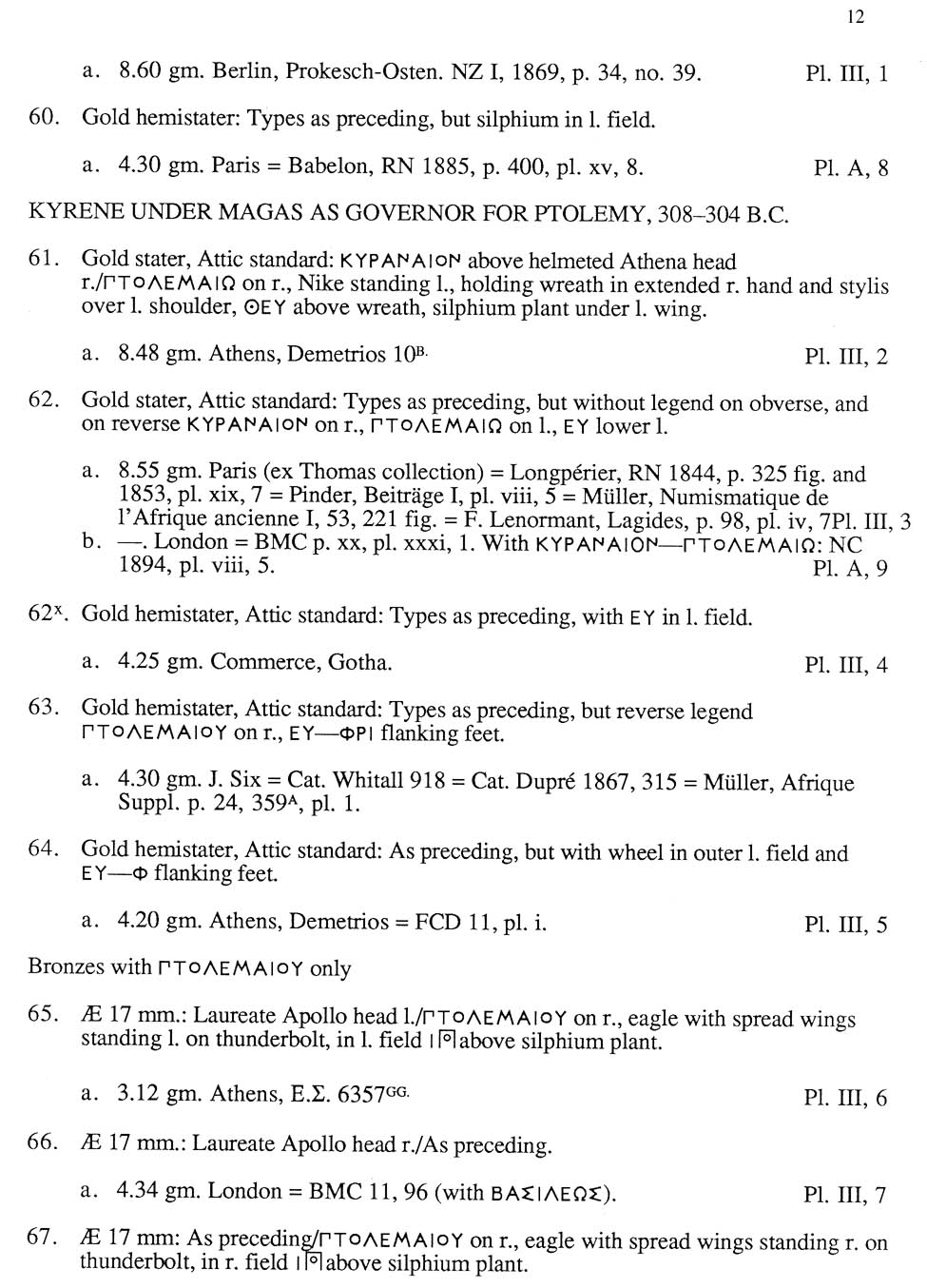 60. Kyrene under Ophellas, AV Hemistater. 61-64. Kyrene under Magas as Governor for Ptolemy I, 308-304 B.C. AV staters and hemistaters. 65-67. Bronze under Magas.