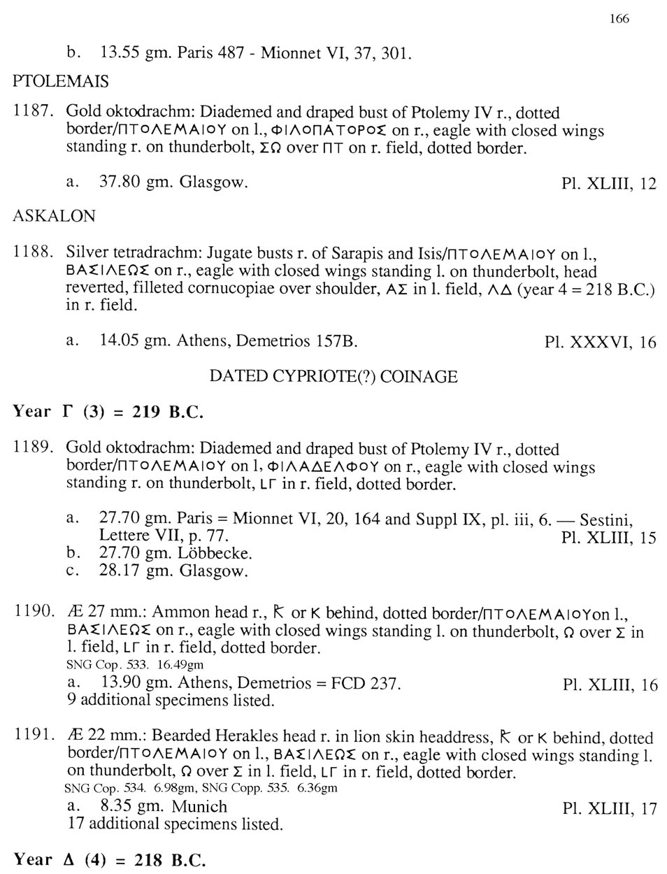 1186-1191. Ptolemy IV Philopator, 221/0-204/3 B.C., AV oktodrachm, AR tetradrachm, AE 27mm, AE 22mm.