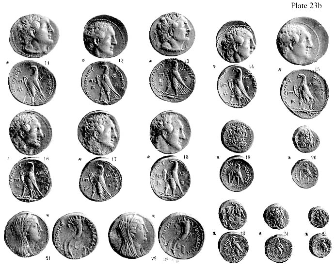 Plate 23b. Ptolemy II, Ioppa mint: AV Arsinoe octodrachms, AR Ptolemy tetradrachms, and bronzes.