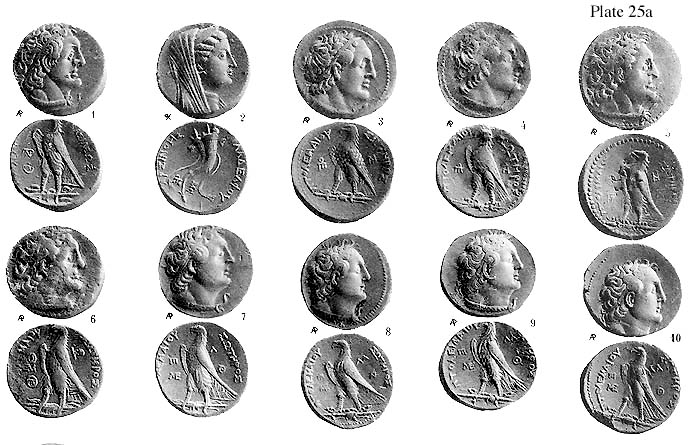 Plate 25a. Ptolemy II, Ptolemais mint. AR Tetradrachms and AV Arsione octodrachm.
