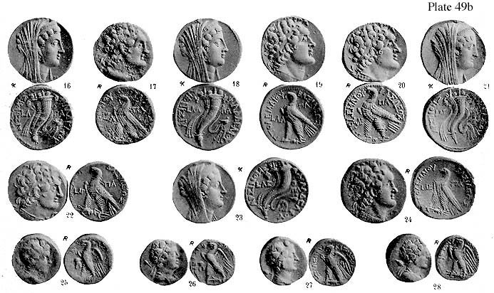 Plate 49b. Sole reign of Ptolemy VI, 163-145 B.C., dated coinage struck in Cyprus. AV octodrachms and AR tetradrachms. Ptolemy XI Alexander, coinage struck in Cyprus, Types of Ptolemy VI, AR didrachms.