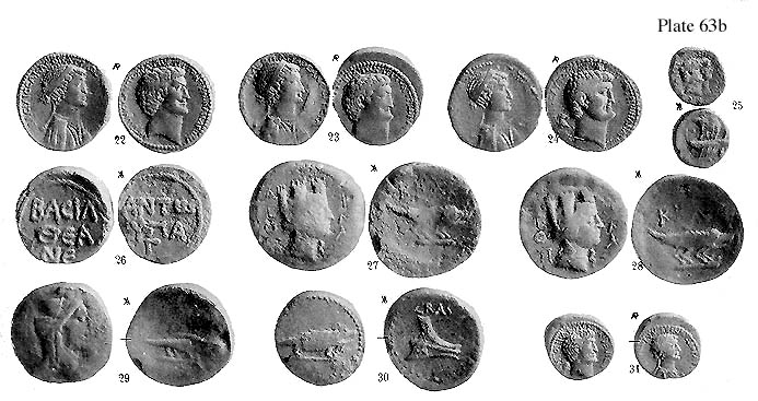 Plate 63b. Kleopatra VII with Ptolemy XIV, XV, and XVI. Coinage struck in Kyrenaika, Kleopatra and Mark Antony, three AR and one AE; P. Canidius Crassus, lieutenant of Antony, bronzes. Roman coinage in Egypt, Kleopatra and Mark Antony, 35-34 B.C., AR denarius.